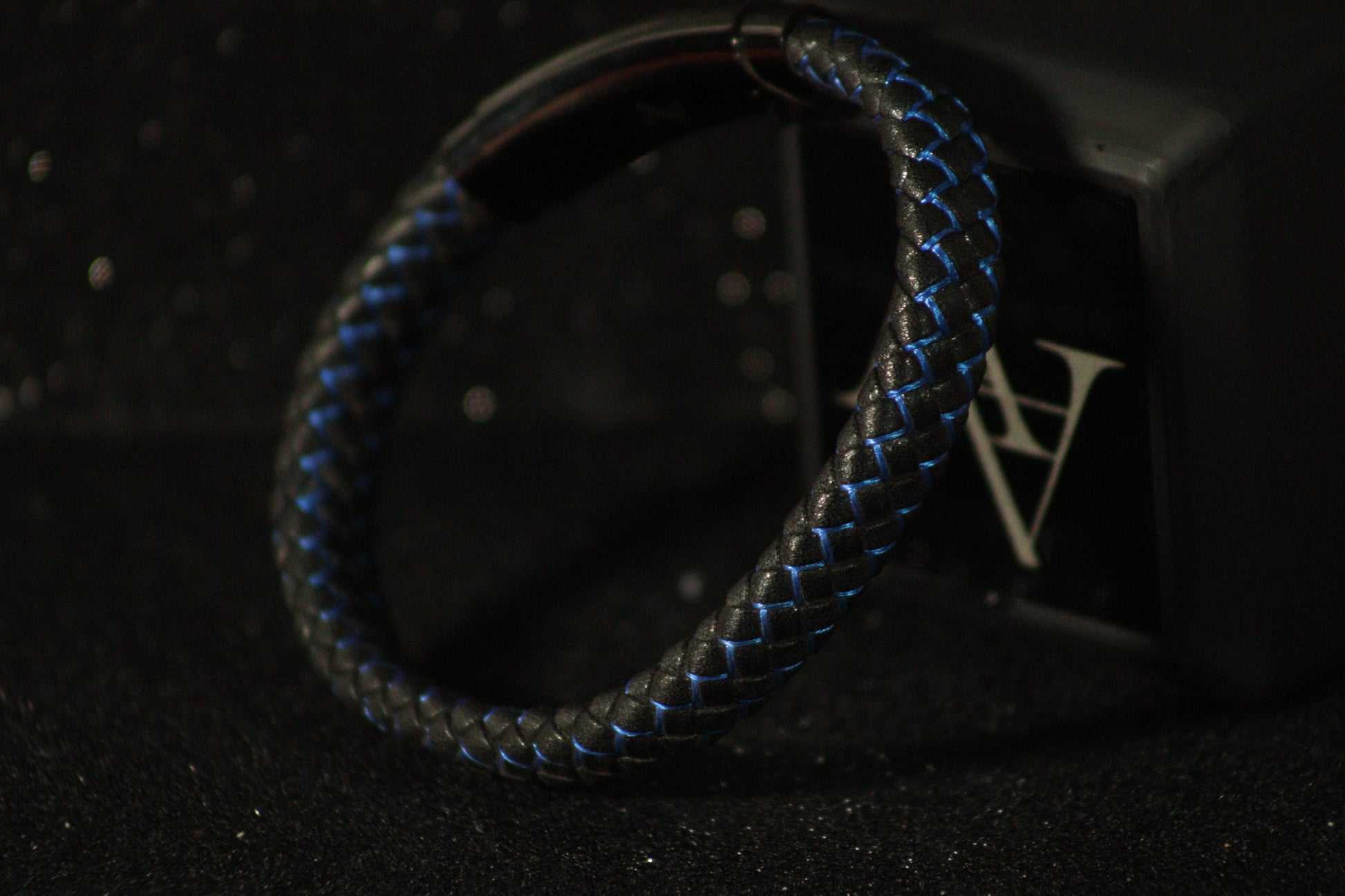 Elevate your style with this handcrafted men's woven leather bracelet featuring a striking black and blue design. Made from premium genuine leather, this bracelet combines durability with sophisticated aesthetics.
